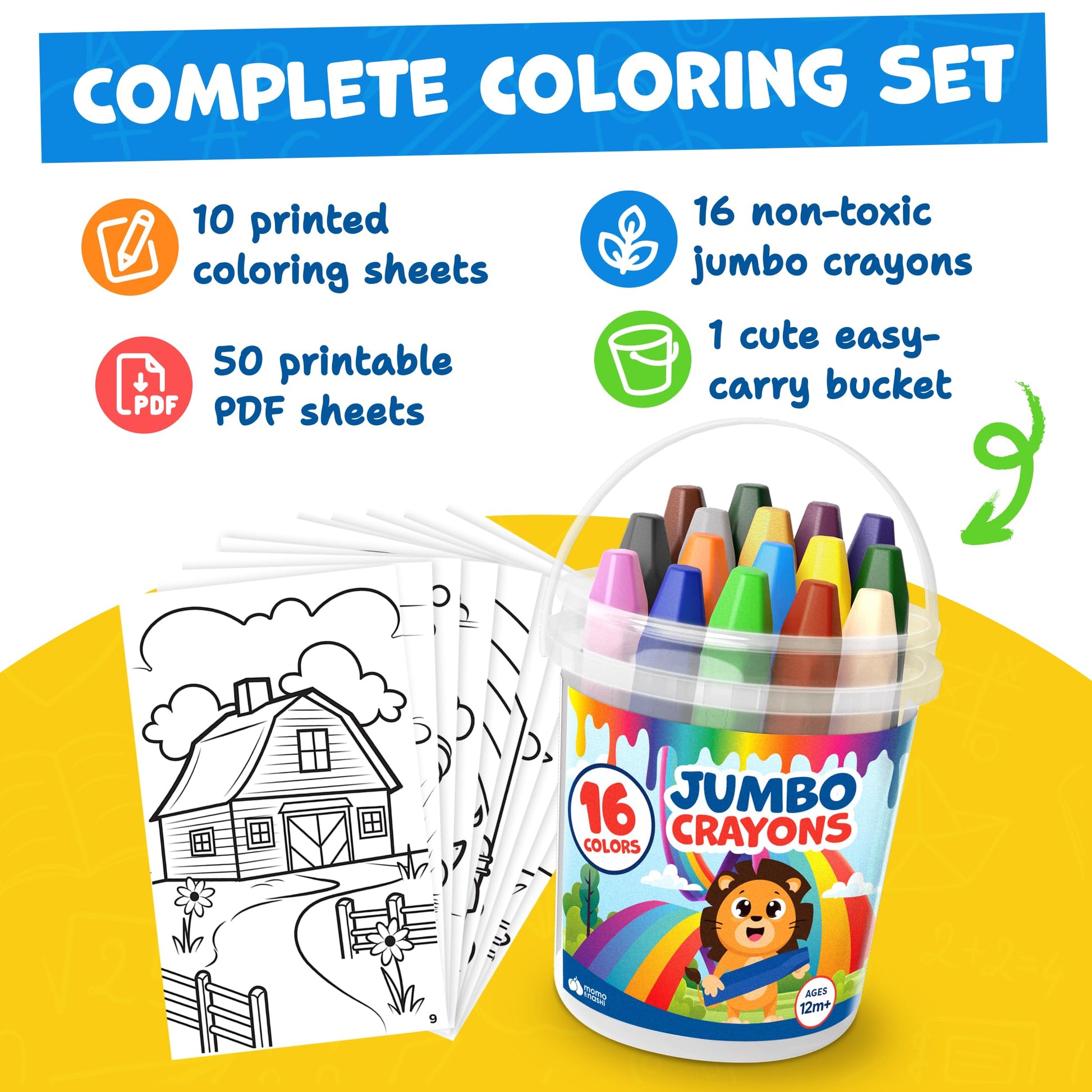 Jumbo Crayons For Toddlers 1-3 - 16pc Toddler Crayons For Kids Ages 4-8 1-3 2-4 - With Printed & PDF Crayon Color Sheets - Non Toxic, Washable, Large & Easy To Grip - Toddler Coloring Art Supplies