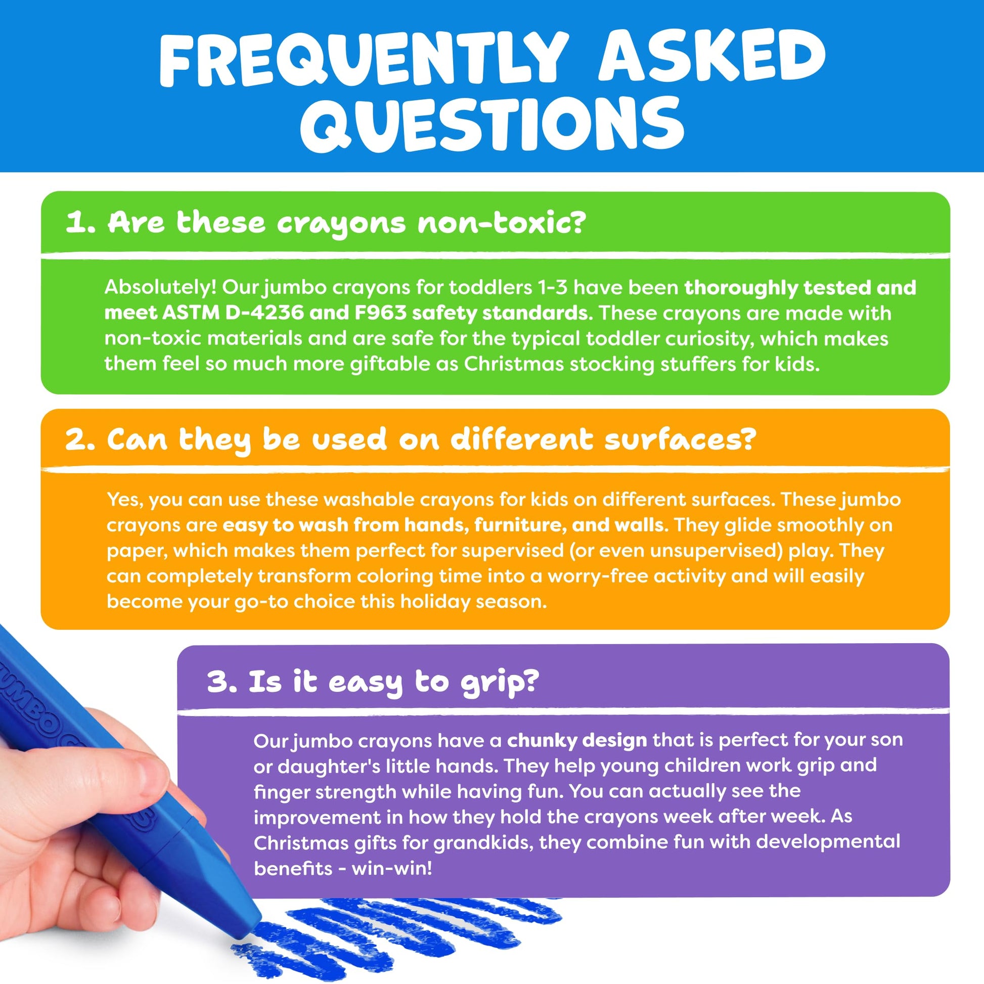 - Super Sturdy, Easy To Hold, Jumbo Crayons That Won’t Break Easily. Large Crayons for Toddlers 1-3 are durable, kid-proof unbreakable crayons that are built to last even through rough handling. The intuitive, hexagonal triangle crayons shape prevents rolling, while the ergonomic grip is perfect for little hands, promoting fine motor skills and hand-eye coordination. Must-have non-toxic toddler crayons for loads of healthy, coloring fun!