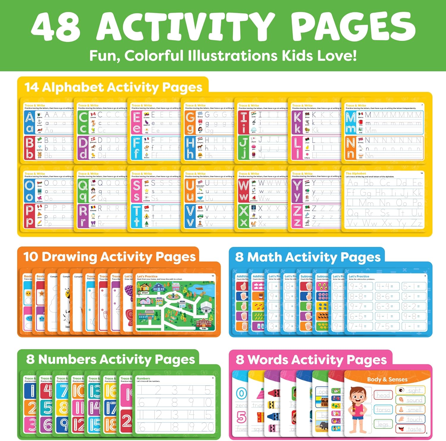 - 48 Fun Learning Activities Across 5 Large Tracing Books For Kids Ages 3-5. A wide variety of activities are included in reusable grooved handwriting workbooks. Topics include: Alphabet, Drawing, Math, Numbers & Words. These grooved writing books for kids 3-5 engage focus, develop multiple cognitive skills and immerse kids in a world of fun & learning! Watch them master words, numbers, addition, subtraction, drawing, etc through grooved letter tracing for kids. A homeschool preschool must have to improve calligraphy and writing skills.